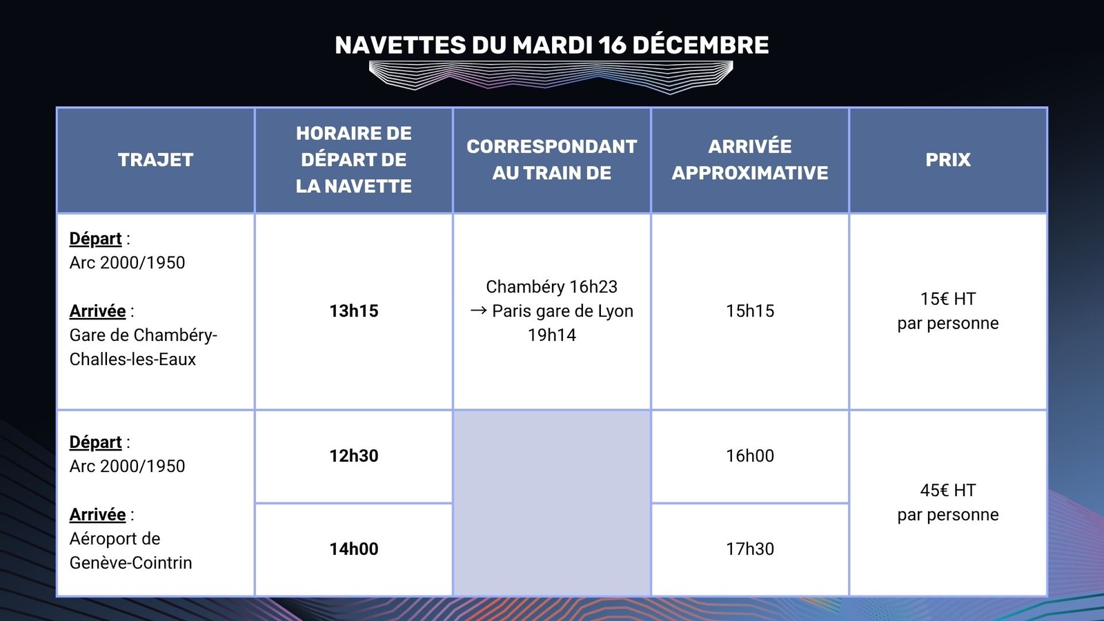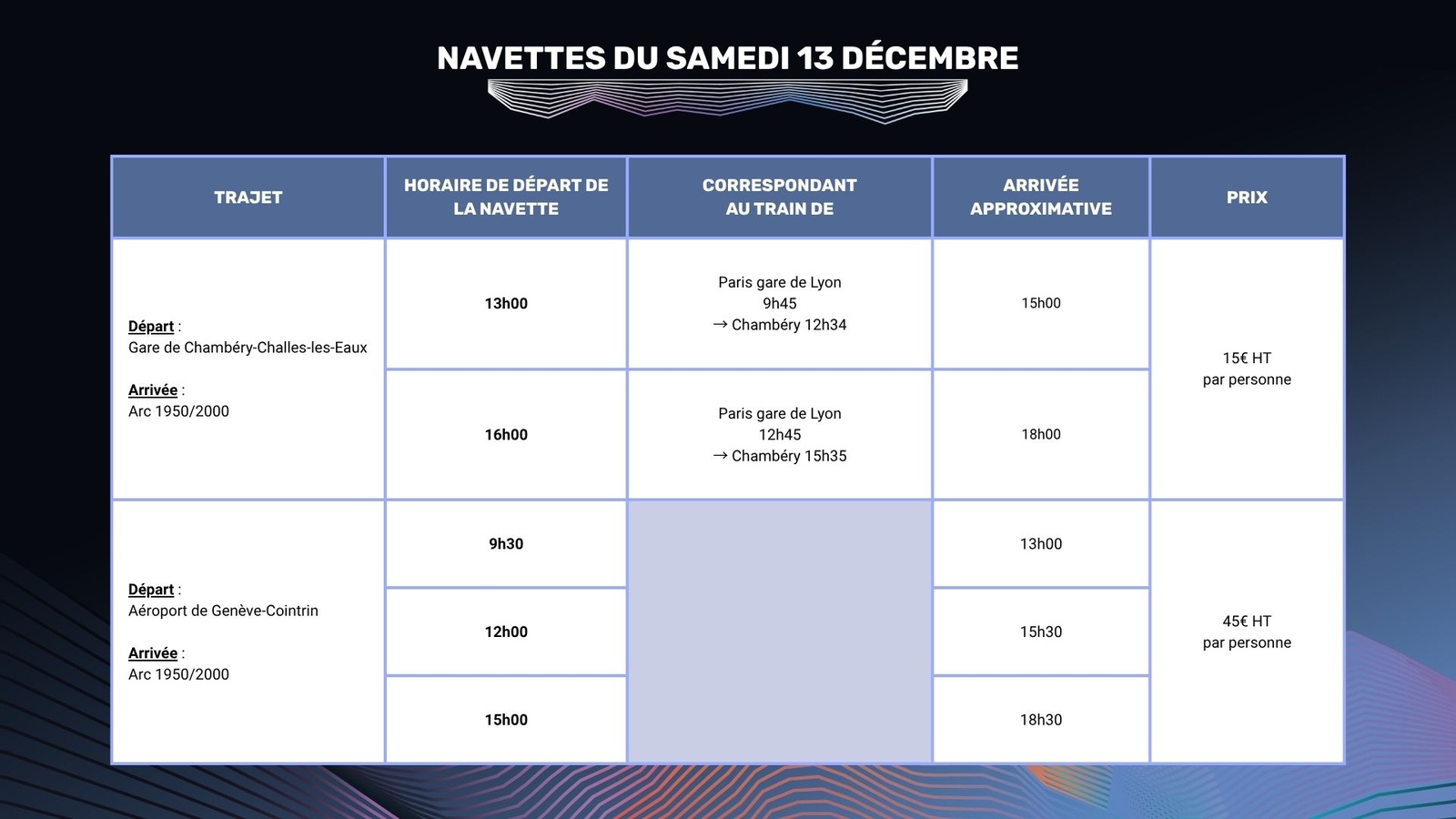 NB : Nous recommandons fortement de prévoir un large délai entre l’arrivée supposée de la navette à l’aéroport/la gare et votre embarquement. La navette peut être retardée selon les mauvaises conditions météo ou selon la circulation.